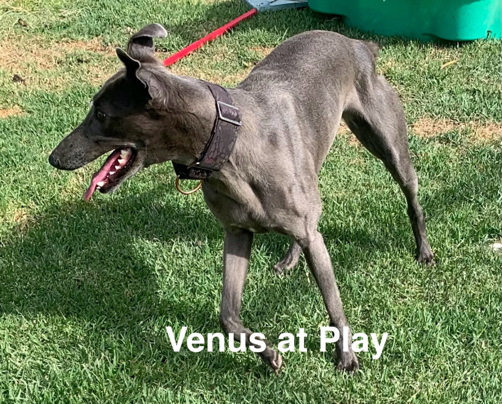 Venus is Connie's daughter to Denzel. She hasn't had any pups yet but we are hoping she comes into season soon so we can breed her with Pericles. Given she has lots of blues and brindles in her lineage, the puppies she'll have will be quite a surprise. Venus is a real character - she has a love/ hate relationship with our horse Joshua who just loves to stand right next to her yard and tease her - it drives her crazy!!.