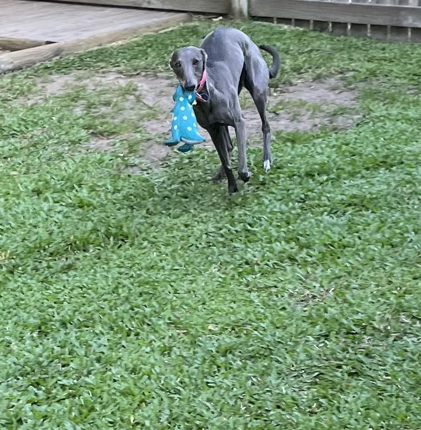 Happy 3rd birthday to our Laci, zombies with her favourite toy, her 🦕 and then her bark day cake and birthday bone and cupcake.