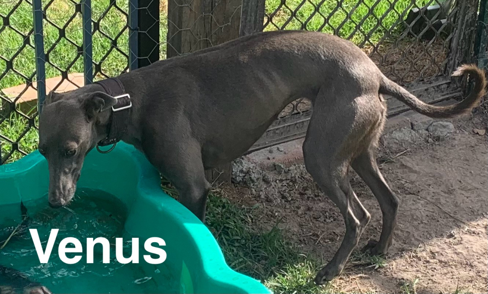 Venus is Connie's daughter to Denzel. She hasn't had any pups yet but we are hoping she comes into season soon so we can breed her with Pericles. Given she has lots of blues and brindles in her lineage, the puppies she'll have will be quite a surprise. Venus is a real character - she has a love/ hate relationship with our horse Joshua who just loves to stand right next to her yard and tease her - it drives her crazy!!.